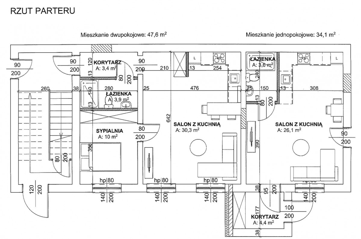 - Parter: dwa lokale mieszkalne,