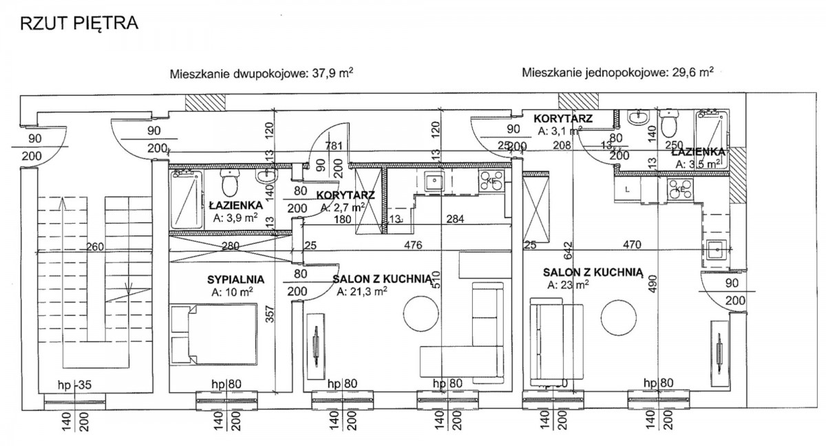 - Pierwsze piętro: jedno duże mieszkanie,