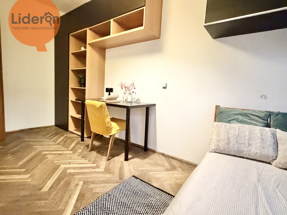 W każdej z sypialni (ok. 10 m2 i 7,5 m2) znajduje się łożko, szafa i biurko, na podłodze jest parkiet.