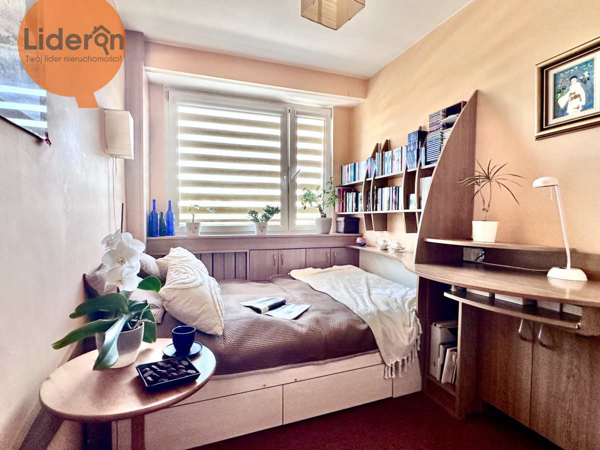 Największy pokój ma ok. 16 m2, na ścianach jest gładź gipsowa, na podłodze panele. Z pokoju można wyjść na balkon z widokiem na duży zielony skwer. Jedna ściana zabudowana - wygospodarowano szafki i szafy.