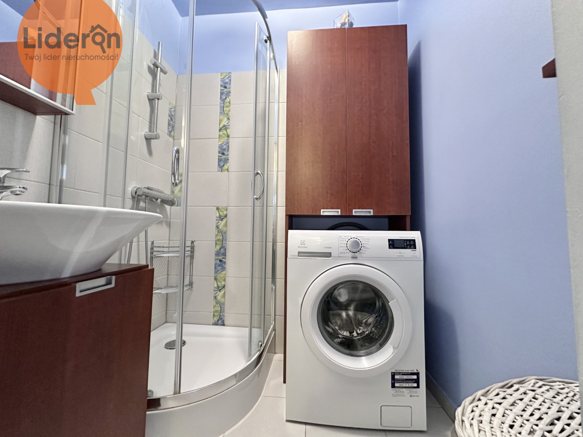 W łazience mieści się kabina prysznicowa, pralka i zabudowa z szafką, umywalka z szafką.