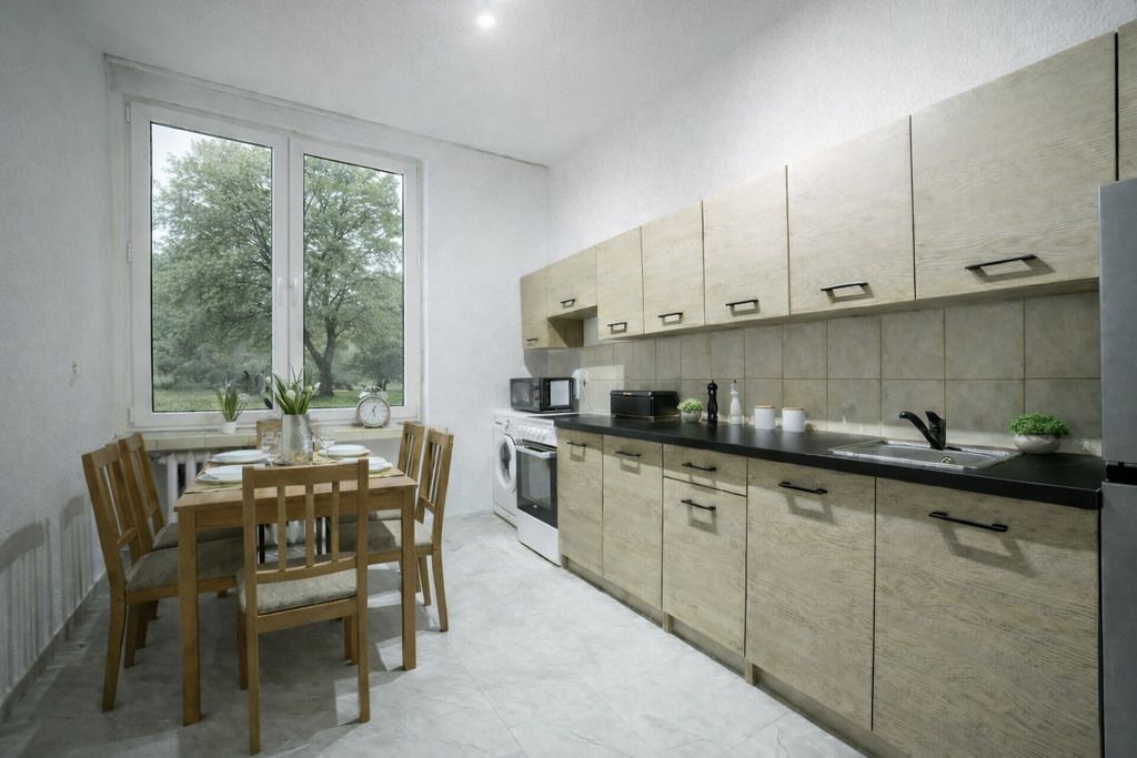 - Kuchnia na wymiar: Z pełnym wyposażeniem, oraz sporym oknem na przestrzeń do spacerowania, tylko dla mieszkańców.