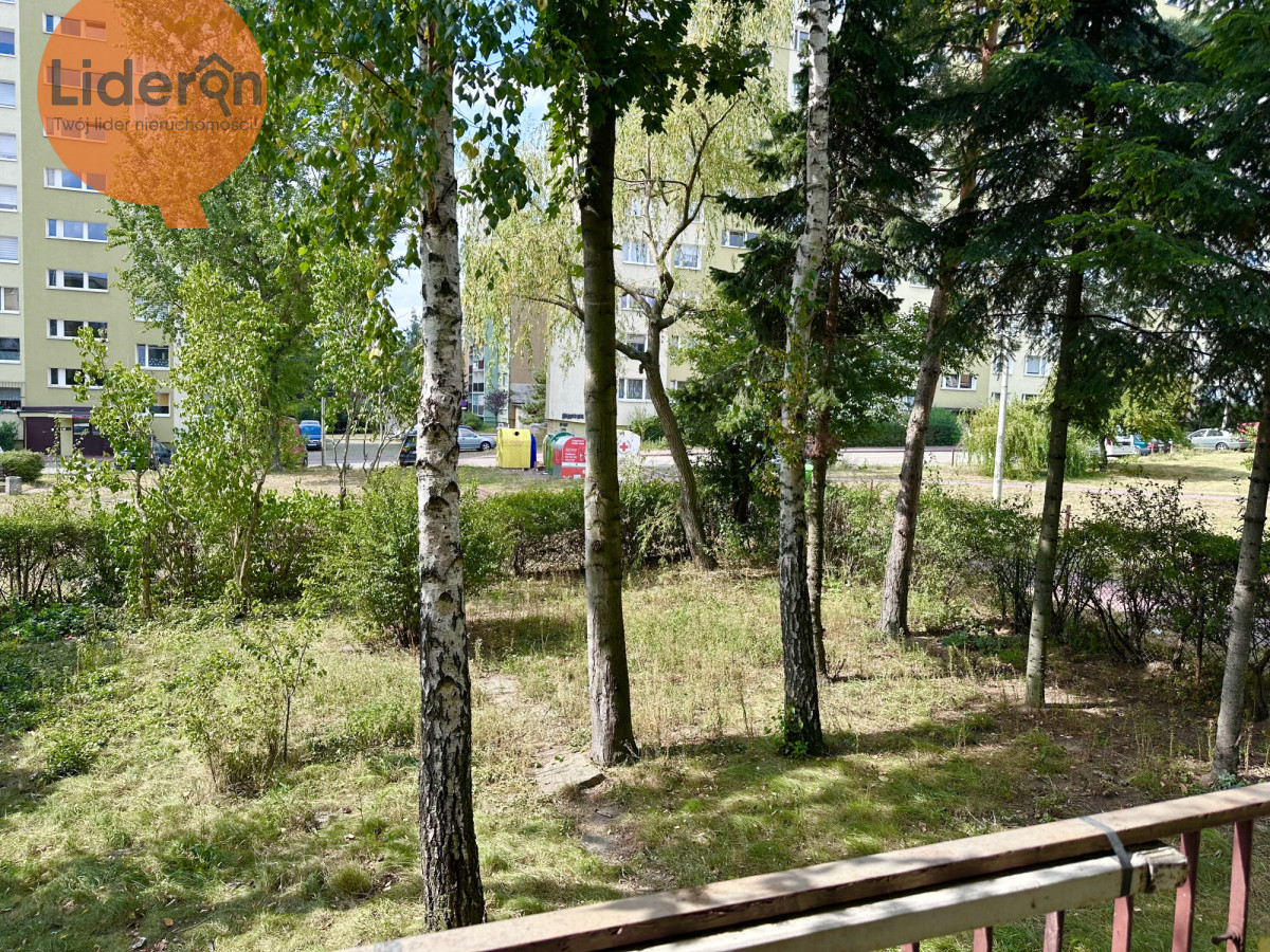 Większy pokój (ok. 19 m2) ma wyjście na balkon. Pod balkonem jest ogrodzony ogródek.