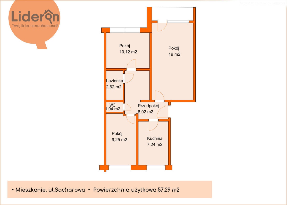 Składa się z 3 pokoi, kuchni, łazienki, wc, balkonu i przedpokoju.