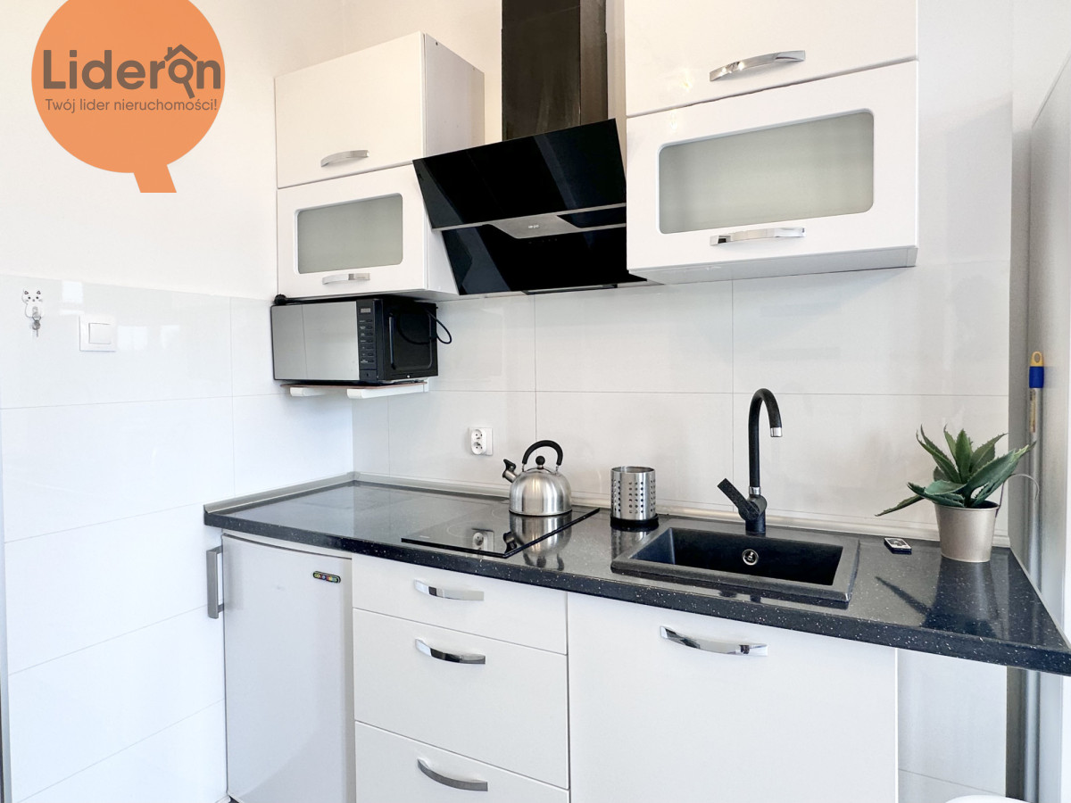 W aneksie kuchennym są meble w zabudowie, lodówka, okap, zlew, plyta indukcyjna. i mikrofalówka.