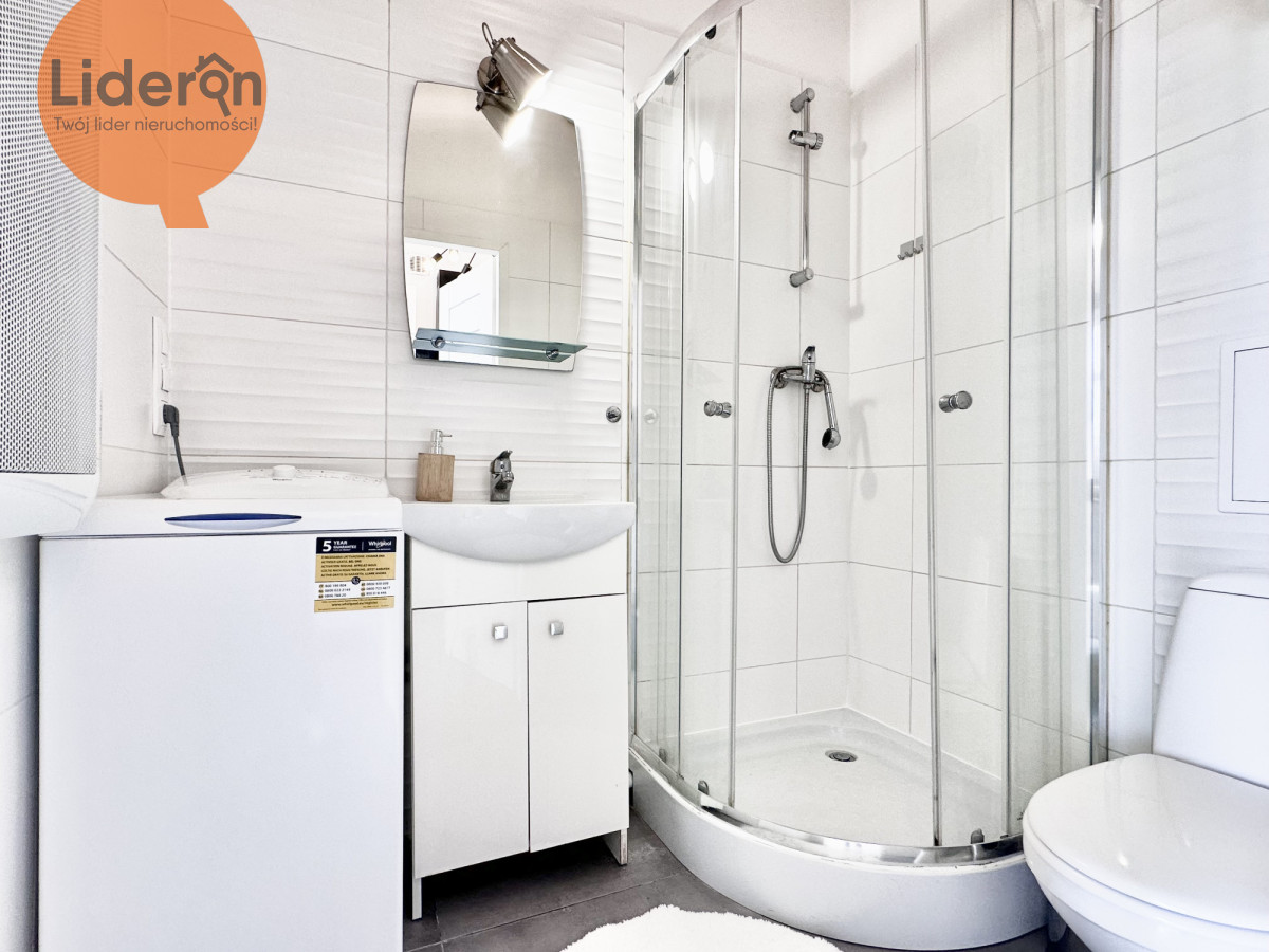 W łazience znajduje kabina prysznicowa, umywalka z szafką, wc i pralka.